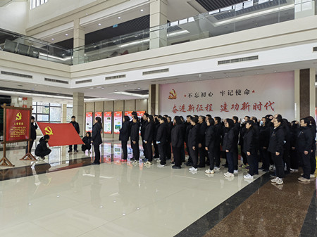 坐落在蔡甸的野战国防园,群山围翠,山水相连。交易中心全体干部职工统一着装、整齐列队、精神焕发、迈着矫健的步伐行走在园区,胸前的党徽在阳光的照射下灼灼生辉,全体党员神情庄重,高举右拳,面向鲜红的党旗宣誓,铿锵有力的誓言字字如磐,昭示着党员同志们坚定不移的政治信念和矢志奋斗的坚定决心。