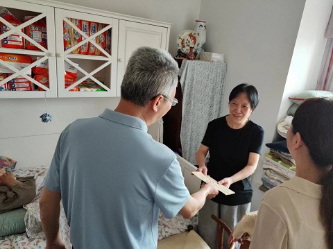 在退休党员刘立光家中,湖北省粮食局党组成员、副局长李硕详细询问了老人的身体状况,叮嘱老人及家属保重身体,有困难第一时间向党总支反映,要求交易中心党总支时刻把退休党员的冷暖放在心上、需求记在心里,让他们实实在在感受到党总支的关怀和温暖。